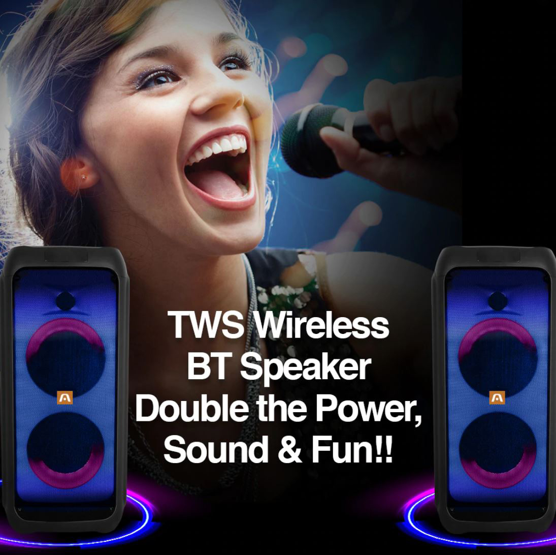El Rave 65 está equipado con 600 vatios de potencia de sonido y una tecnología de graves de alta gama. Viene con bocinas dobles de 5,25″, efectos de iluminación, una batería de 4400 mAh e incluye un micrófono inalámbrico.  Transporte fácil y portátil gracias a su asa de transporte.  Si necesita más potencia, habilite la función TWS y empareje una segunda para duplicar la ¡Potencia, doble diversión!Este altavoz también incluye una entrada de micrófono para mejorar aún más la diversión del karaoke.